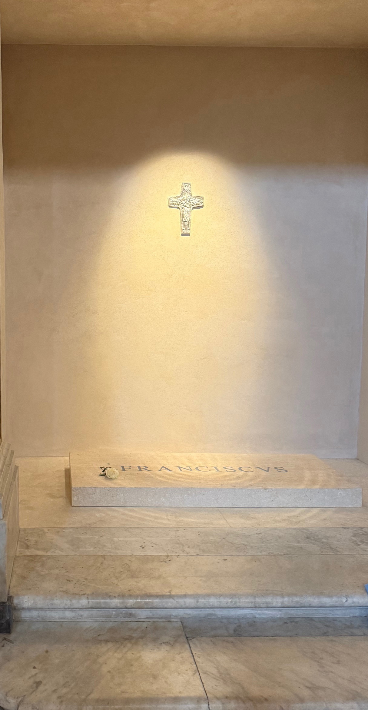 The bronze plaque bears a Latin inscription of 160 characters in two different sizes, which reads: “Francis Supreme Pontiff, who paused 126 times in devout prayer at the feet of the Salus Populi Romani; according to his will, rests in this Papal Basilica.”
